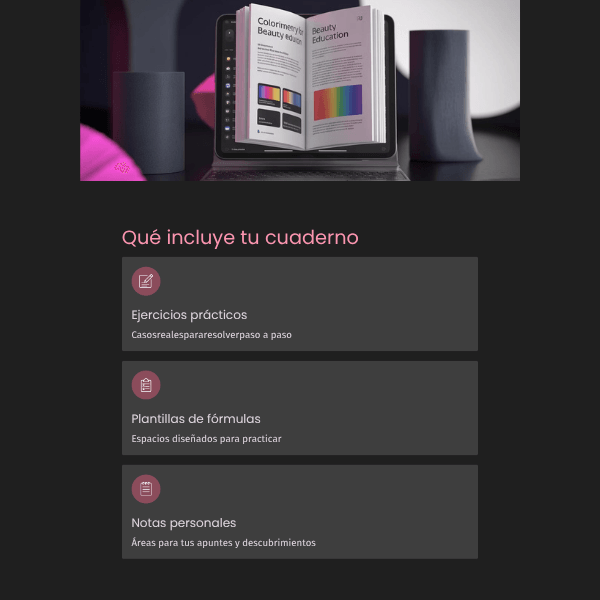He creado este cuaderno de ejercicios prácticos de colorimetría para que estilistas y amantes del cabello puedan aprender de manera práctica, divertida y efectiva, mientras conectan con su creatividad y propósito profesional.